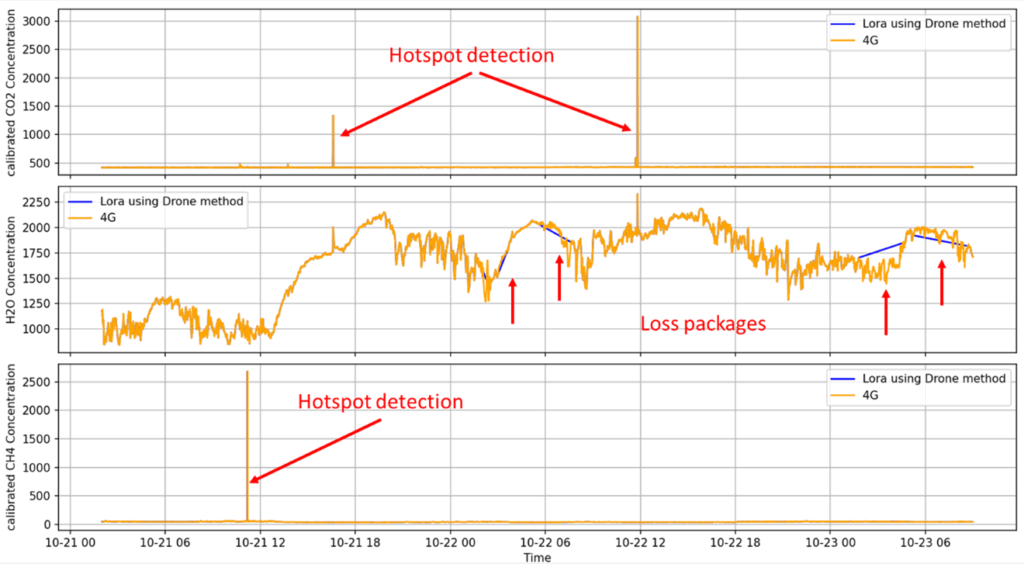 - End-to-end data transmission was successfully tested: the drone-based hotspot collected greenhouse gas measurements from static devices in remote areas.