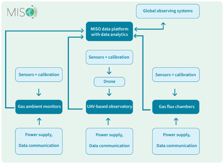 MISO develops an autonomous observation system for monitoring of emissions of CO2 and Methane, the two most important greenhouse gases. The system is modular and is suited for use in hard-to-reach areas such as the Arctic or wetlands. It combines three observing platforms (a static tower-Gas ambient monitor , a static gas flux chamber and a UAV-based observatory using NDIR sensing technologies ) with a cloud platform. The system can be operated remotely , with minimum on-site intervention.